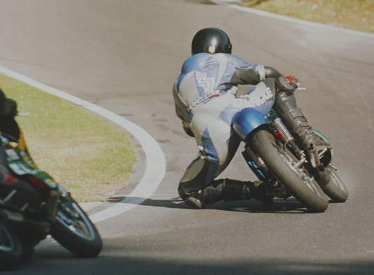 Adrian trying hard to emulate Lea, hanging off the bike in a totally 'over the top' manner.