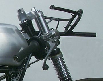 This is the headstock bracing. This is on the frame that Andy Bacon modified, not the one that I did. The tank mounting is a 11mm (ish) diameter tube going through both bracing pieces and welded in place to strengthen the lot. The rubbers are from a small Kawasaki model - my local dealer had them in stock but wasn't quite sure what they were from!