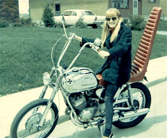 Here is a picture of my 1966 Hussler 250cc. I bought it new for under $900.00 Canadian. In the winter of 1967 I stripped it down and had all the parts chromed - Frame, fork, swing arm, and also the 'chain'! I replaced the seat with a "banana seat". At the time I thought it was a great idea. The girl on the bike was 16 and I thought that she was a good idea too - she still is today. We married when she was 20.